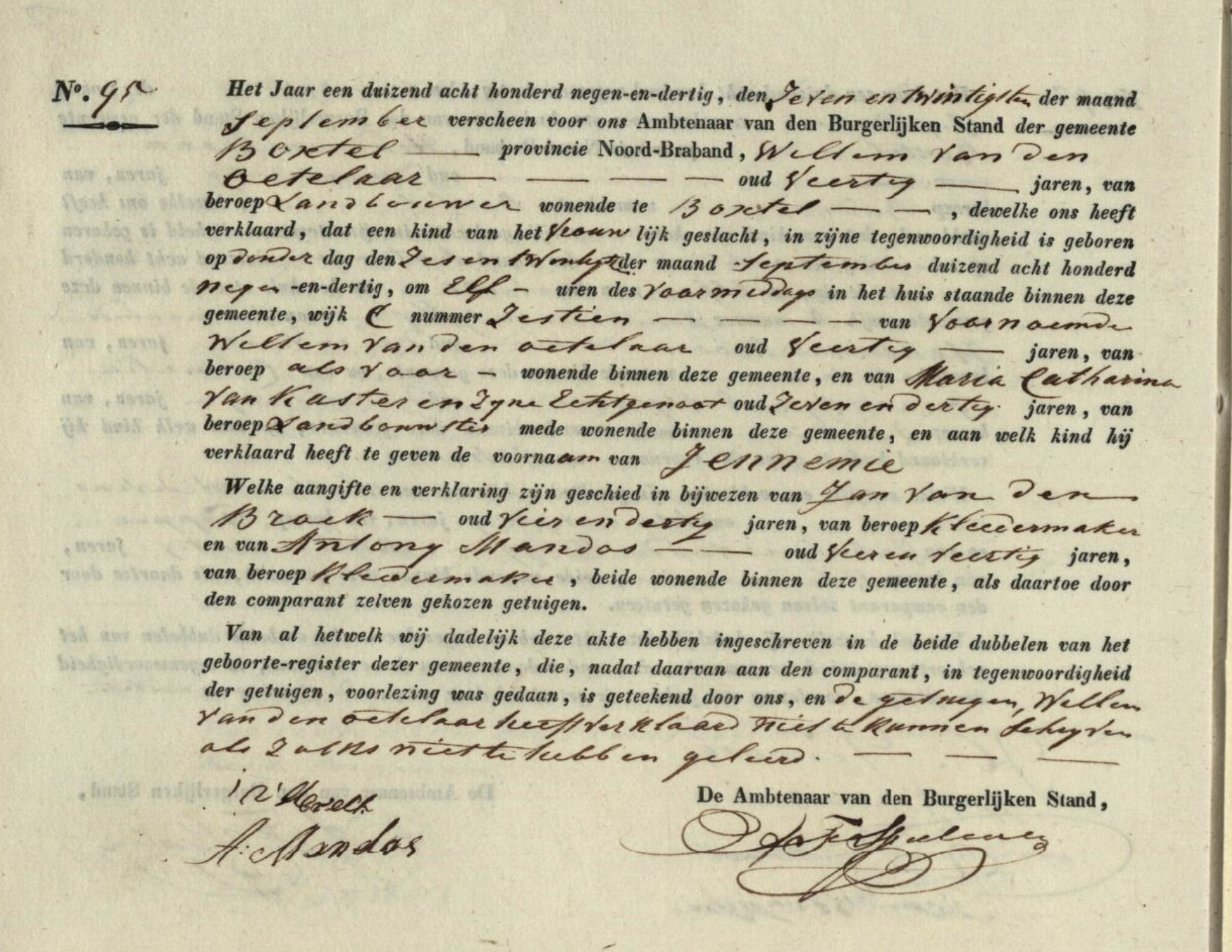 | Notitie bij geboorte Brabants Historisch Informatie Centrum te Brabant, BS Geboorte Bron: boek, Deel: 1087, Periode: 1839, Boxtel, archieftoegang 50, inventarisÂnummer 1087, 27 september 1839, Geboorteregister Boxtel 1839, aktenummer 95 |